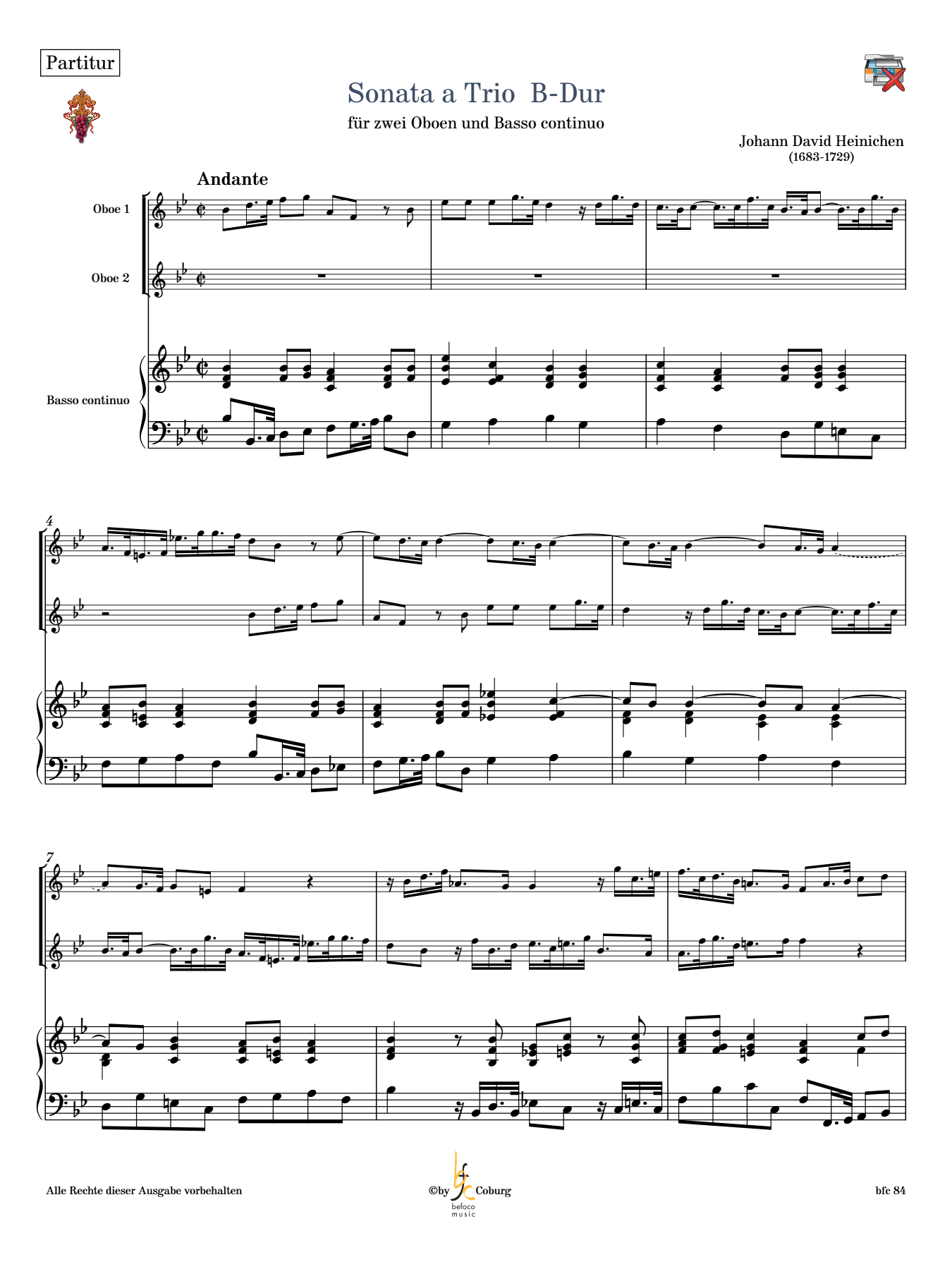 Auf dem Titelblatt ist vermerkt: Sonata a Trio | et Bn | Oboe Primo | Oboe Secondo | é | Basson Dell Signor Heinichien.