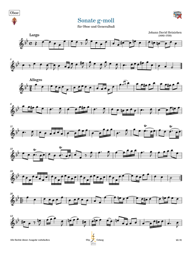 Flöten-, Violin- und sieben Sonaten für Oboe und Generalbaß. Neben der hiermit edierten Sonate von Johann David Heinichen (Seiten 156-158, das 33ste Werk des Bandes,) sind auch Oboenwerke von Georg Friedrich Händel, Anonymus, Johann Sigismund Weiss, Christoph Förster* und Johann Heinrich Freitag ** in handschriflticher Kopie enthalten. Außerdem liegt dort eine Sonate von Heinichen, die bei Seibel als Violinsonate gelistet ist: Diese Sonate ist auch in einem Autograph einer anderen Bibliothek als Oboensonate überliefert und bei befoco music erschienen (bfc 92).